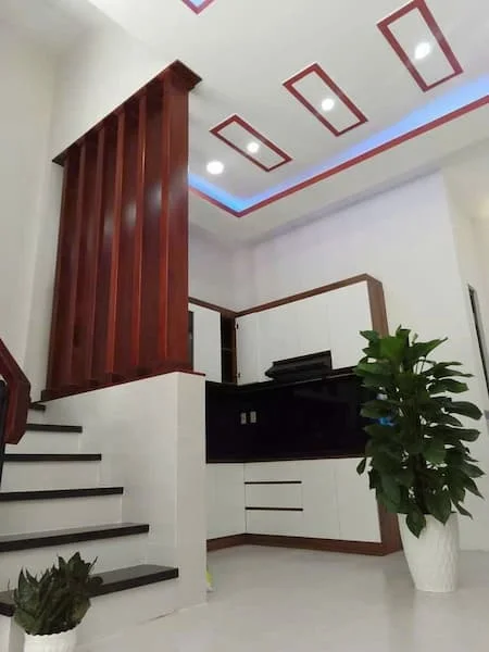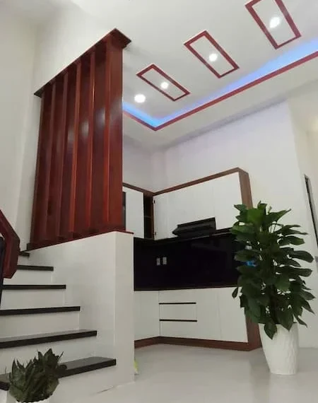 + Phòng khách & Bếp: Thiết kế mở, trần thạch cao tích hợp đèn LED hiện đại. Khu vực bếp có tủ kệ gỗ trắng sạch sẽ.