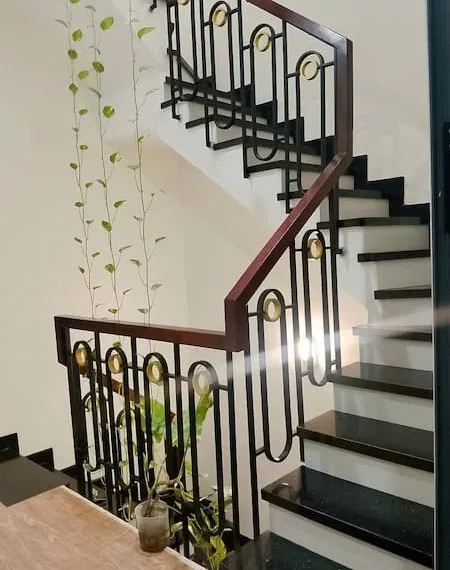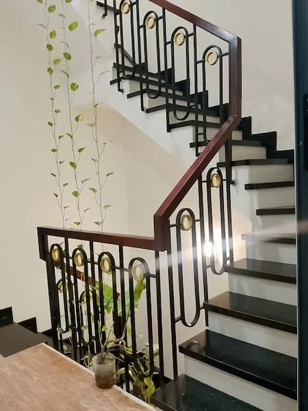 + Cầu thang: Sử dụng đá hoa cương đen, tay vịn gỗ và lan can sắt đồng bộ với phong cách ngoại thất.