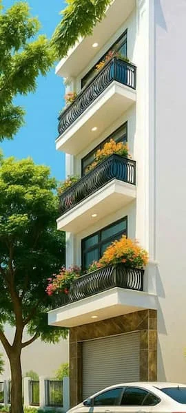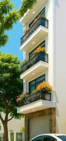 – Kiến trúc ngoại thất: Nhà có thiết kế mặt tiền hiện đại với ban công sắt uốn nghệ thuật, trang trí nhiều cây xanh và hoa, tạo không gian sống thoáng đãng. Tầng trệt có cửa cuốn tiện lợi cho việc để xe ô tô hoặc kinh doanh.